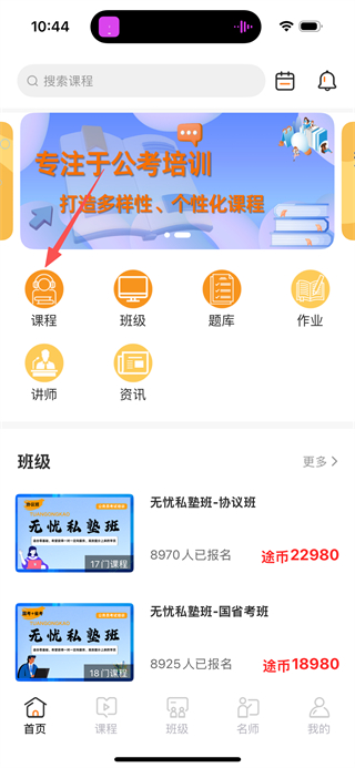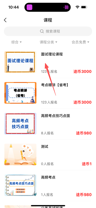 1、进入途岸教育后,点击课程选项,可进入课程列表页面。