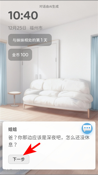 2、在剧情对话界面,依照红色箭头指引,点击下一步按钮推进对话内容,解锁与妹妹Yuki的相处剧情。