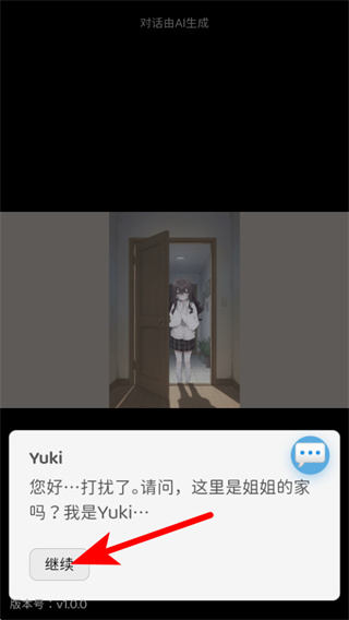 3、跟随红色箭头提示,点击继续按钮推进后续对话,完成Yuki上门拜访的剧情环节。
