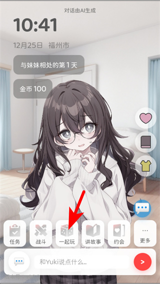 4、剧情推进后,紧跟红色箭头指引,点击一起玩按钮,开启与Yuki的互动玩法,推进相处流程。