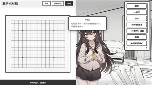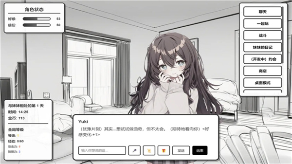 在充满生活气息的虚拟世界里,玩家与妹妹Yuki开启同居时光,Yuki并非固定剧本角色,会记住玩家的对话、喜好与习惯,从初识到熟悉,逐步成长为独一无二的家人,玩家可通过多样互动,在日常陪伴中积累回忆,解锁更多温馨剧情与玩法,感受专属的虚拟陪伴。