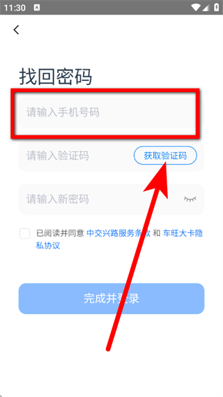 3、在找回密码页面,输入手机号码,点击获取验证码。