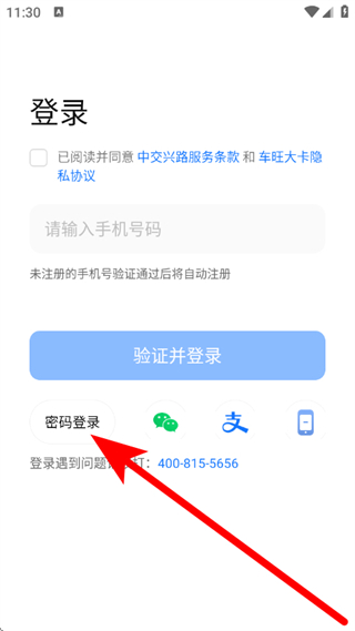 1、在车旺大卡登录页面,点击密码登录,进入密码登录页面。
