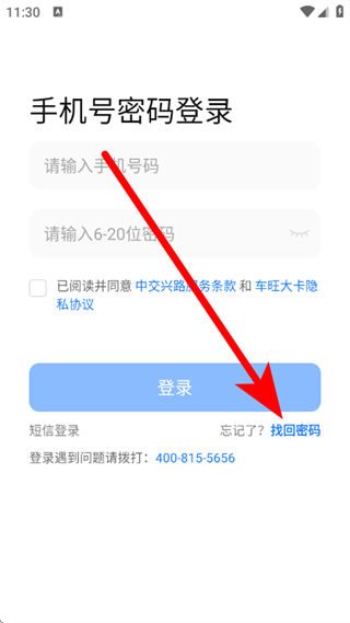 2、在密码登录页面,点击找回密码,进入找回密码页面。