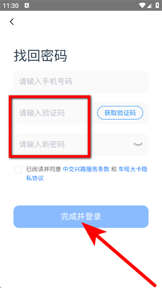4、输入验证码,设置新密码,点击完成并登录,完成密码找回。