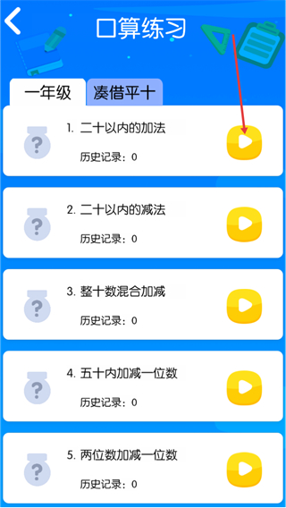 1、进入口算练习的凑借平十分类界面,选择对应练习项如二十以内的加法等,点击右侧播放按钮即可开始对应口算练习。