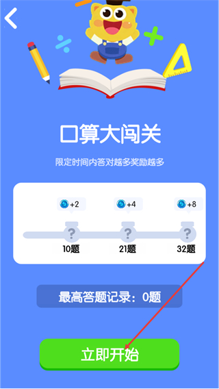 2、在口算大闯关界面,了解限定时间内答对越多奖励越多的规则后,点击立即开始按钮,参与限时答题挑战。