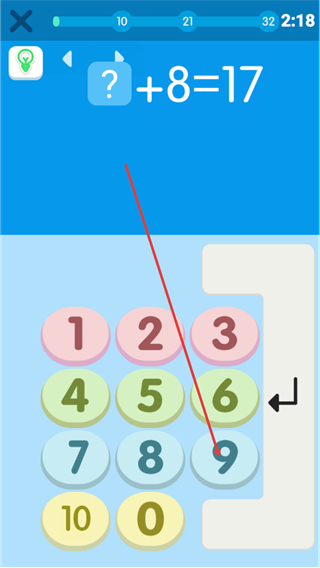 3、答题界面中出现算式,计算出结果后,点击数字键9,输入答案以完成该道口算题的作答。