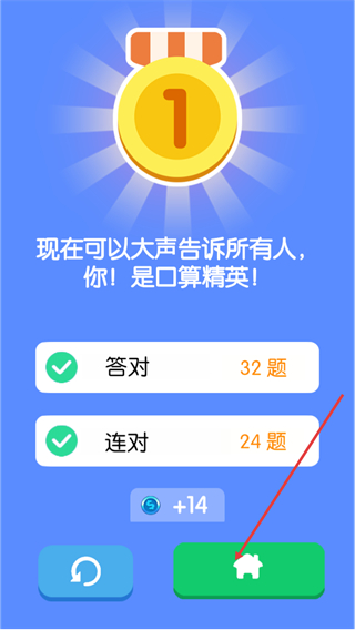 4、答题结束后进入结算界面,查看答对、连对的题量数据及奖励,点击房子按钮可返回主界面。