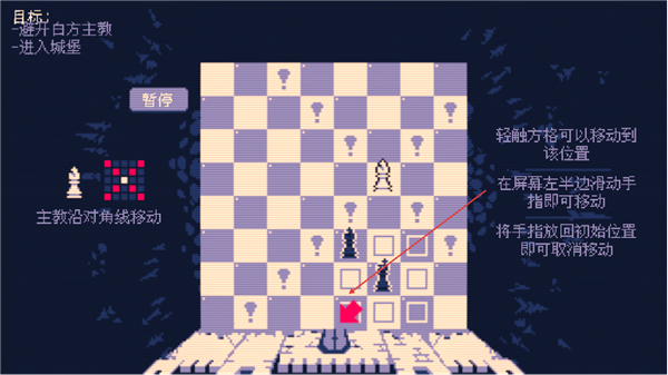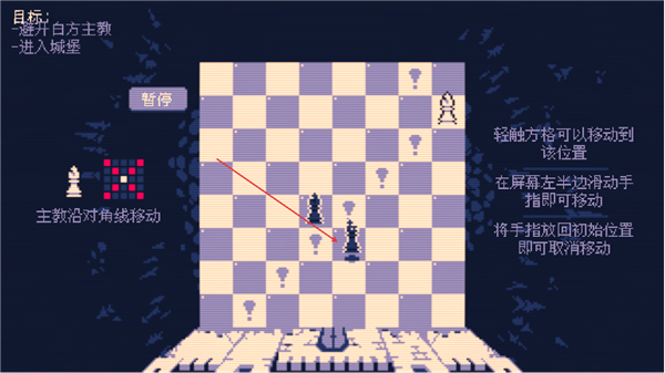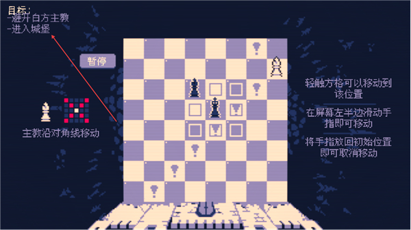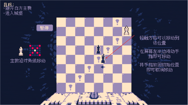 1、明确目标是让己方主教进入城堡,主教沿对角线移动,轻触格子可移动到对应位置。