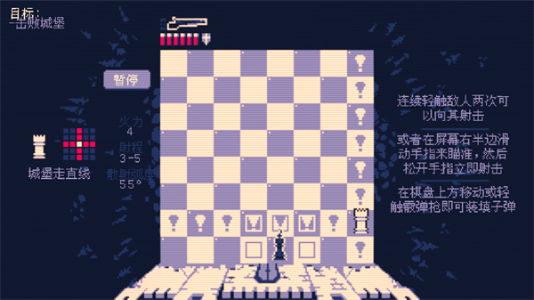 沿用国际象棋棋子移动规则,国王保留经典走位限制,可对特定范围内的白棋发动攻击,射击后必须移动角色完成装弹,攻防博弈充满独特的战术性。