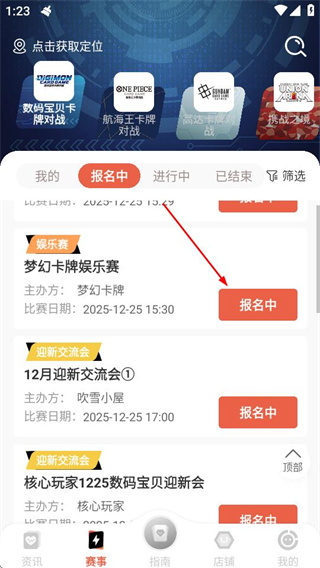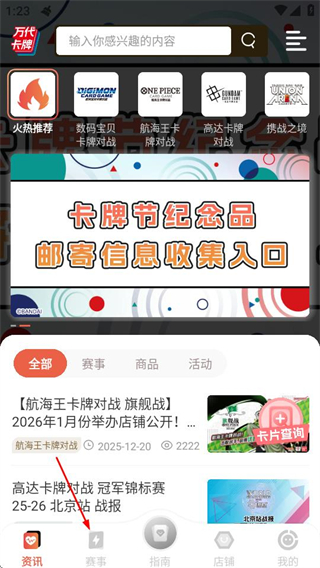 1、进入万代卡牌后,点击底部的赛事选项,可进入赛事页面。