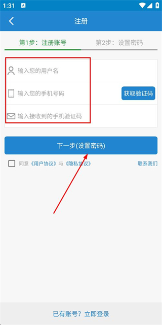 2、在注册账号页面填写相关信息后,点击下一步设置密码。