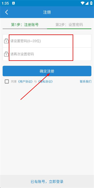 3、在设置密码页面输入密码,点击确定注册完成注册操作。