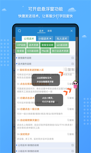 电脑版与手机版实时同步话术数据,手机端支持悬浮窗一键发送,电脑端自动吸附聊天窗口,满足客服办公、出差等多场景使用需求。