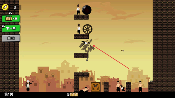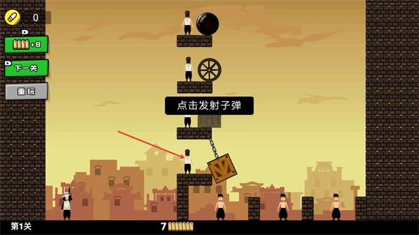2、第1关界面中,根据提示点击发射子弹,瞄准目标区域发射子弹,利用场景中的机关如悬挂木箱来击败敌人。