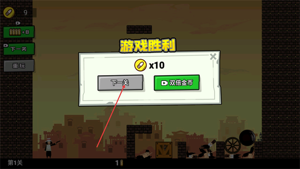 4、关卡通关后出现游戏胜利界面,获取子弹奖励后,点击下一关按钮进入后续关卡,继续游戏挑战。