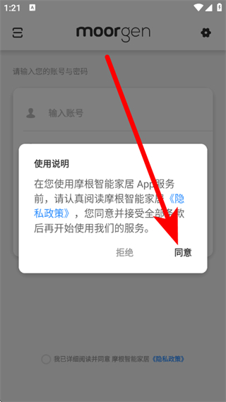 1、打开摩根全屋智能,点击同意按钮,进入账号登录页面。