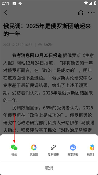 3、在弹窗中选择对应分享渠道,即可将该新闻内容分享出去。