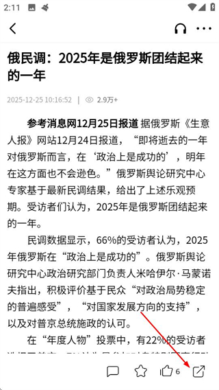 2、在新闻详情页面,点击底部的分享按钮,会弹出分享方式选择弹窗。
