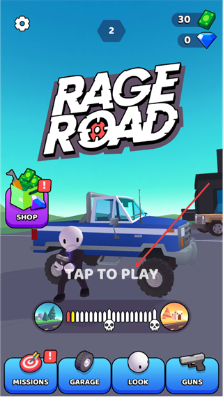 1、在街口枪战主界面,点击TAPTOPLAY按钮启动游戏,界面还包含商店、任务等功能按钮,可提前配置道具或查看关卡任务。