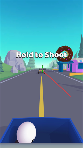 2、进入游戏后,依据提示HoldtoShoot,按住操作区域触发射击,瞄准前方目标如敌方车辆,发起攻击以推进战斗进程。