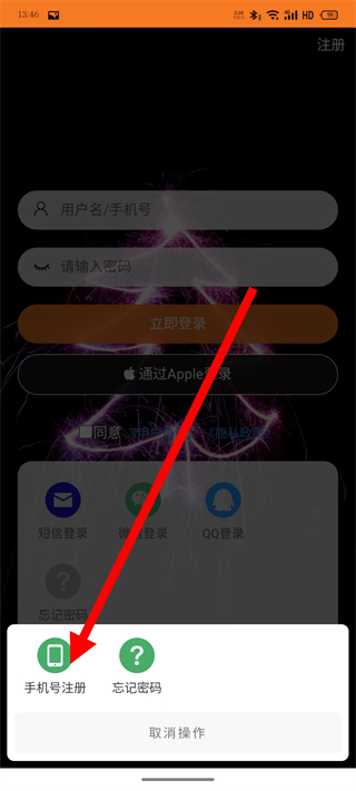 2、在弹窗中,点击选择手机号码注册,进入手机号注册页面。