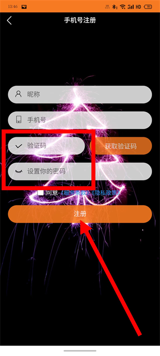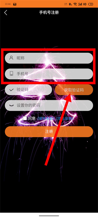3、在注册页面,输入昵称和手机号,点击获取验证码。