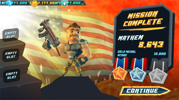 4、完成任务后会出现MISSIONCOMPLETE提示,查看获得的奖牌后,点击CONTINUE可进入下一个任务环节。