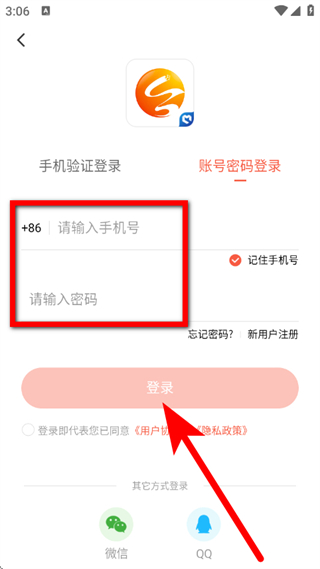 4、在登录页面,输入手机号和密码,点击登录,完成登录。