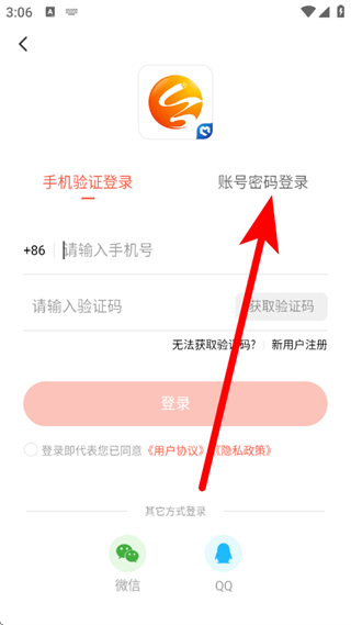 3、在登录页面,选择账号密码登录,切换至账号密码登录界面。
