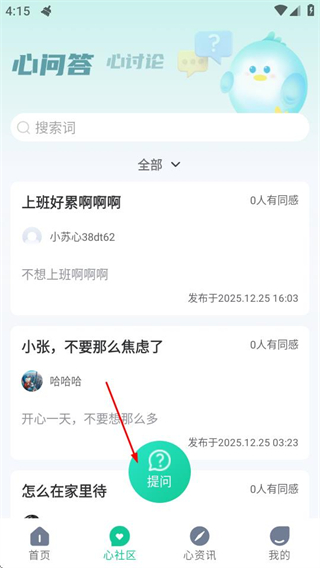 2、在心问答页面,点击底部的提问按钮,可进入提问问题页面。