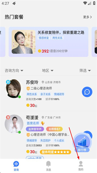 1、进入岸涌咨询后,点击底部的我的选项,可进入个人中心页面。