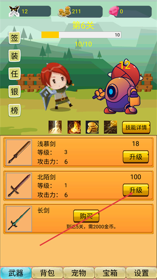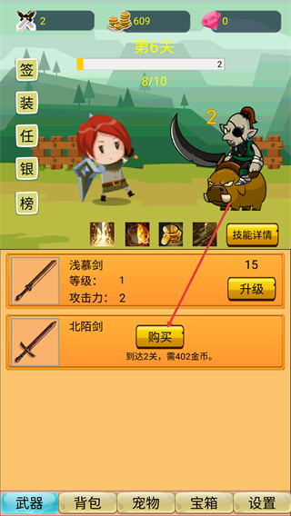 1、在武器界面,当金币满足条件时,点击北陌剑对应的购买按钮,获取该武器以提升角色攻击力。