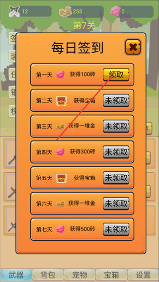 3、打开每日签到界面,点击第一天对应的领取按钮,获取100砖的签到奖励,后续奖励需累计签到领取。