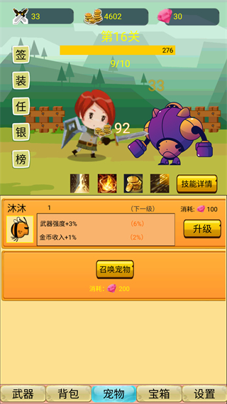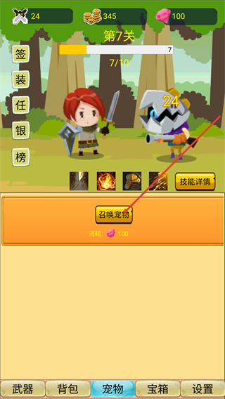 4、在第7关的宠物界面,拥有足够砖石时,点击召唤宠物按钮,消耗100砖召唤宠物辅助参与战斗。