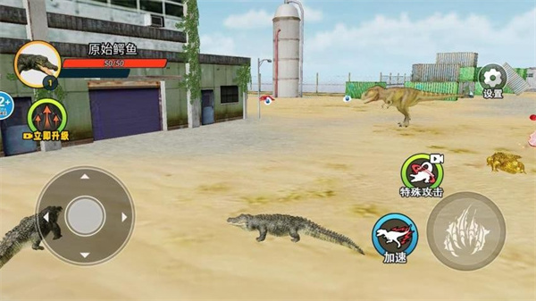 进入后利用虚拟摇杆控制幼年鳄鱼四处探索,遇到可食用的物品或弱小猎物时发起攻击,获取经验值;看到大鳄鱼等天敌时立即躲避,避免被猎杀。
