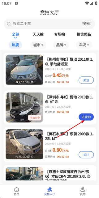 1、在恒信拍首页点击底部竞拍大厅选项,进入竞拍车辆列表页面。