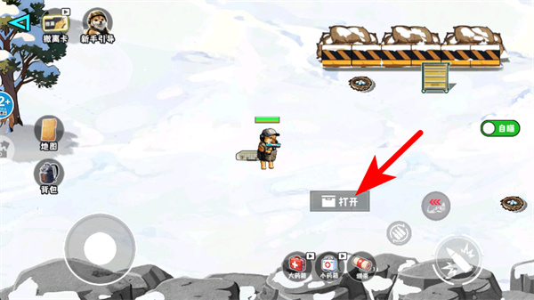 2、游戏中依照红色箭头指引,靠近场景中的物资箱并点击打开按钮,获取箱内资源如道具、物资,为后续战斗生存做准备。