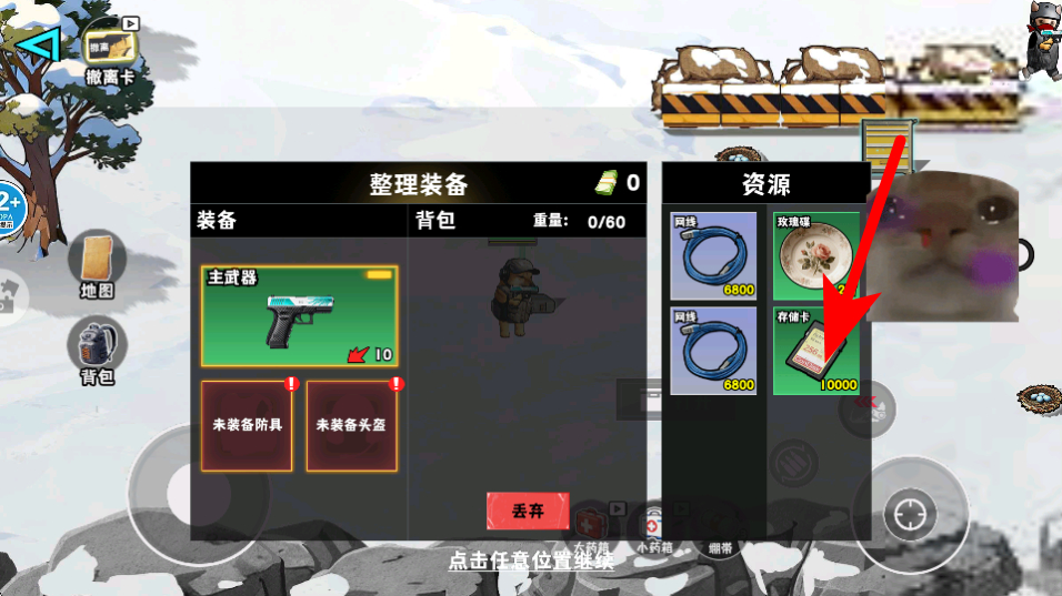 2、游戏中依照红色箭头指引,在整理装备界面查看资源如撤离卡,确认关键道具的持有情况,为后续探索或撤离做准备。