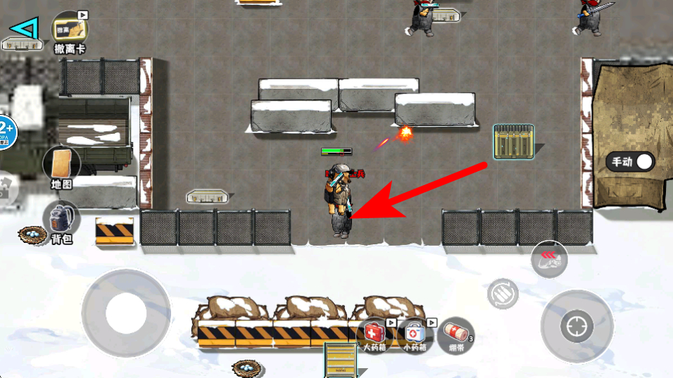3、紧跟红色箭头指引,操控角色在场景中移动,利用掩体如石块、围栏躲避敌方攻击,同时调整站位靠近目标区域探索。