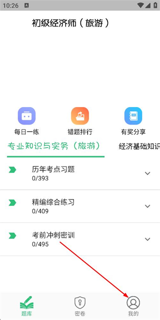 1、在初级经济师题库页面点击底部我的选项,进入个人中心页面。