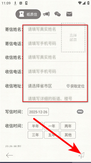 4、依次完善寄信信息和收信信息选择收信时间,即可将这封信寄给指定的收信人。