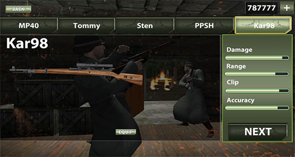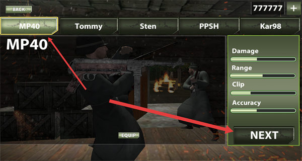 2、武器选择界面,选定MP40后点击NEXT,完成武器配置,进入关卡选择环节,准备参战。