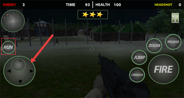 3、进入关卡后,点击RUN按钮调出摇杆,操控角色移动,探索战场区域,定位敌方目标。