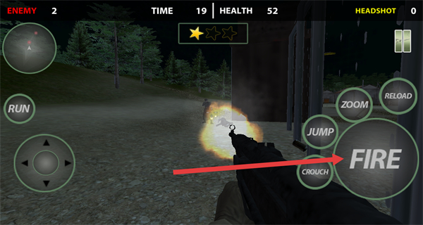4、被敌人发现后,点击右侧FIRE按钮开火,击杀敌人,推进关卡进度,维持生命值完成任务。