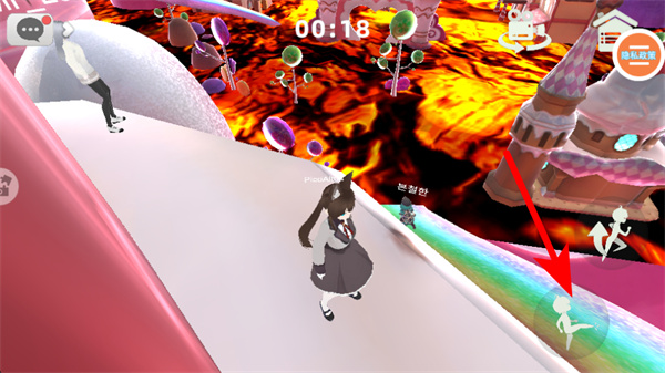3、紧跟红色箭头指引,持续操作移动按钮,控制角色在不同场景如草地、糖果主题区域间切换,探索更多内容。