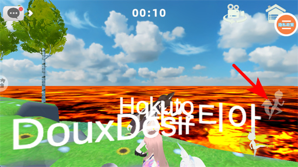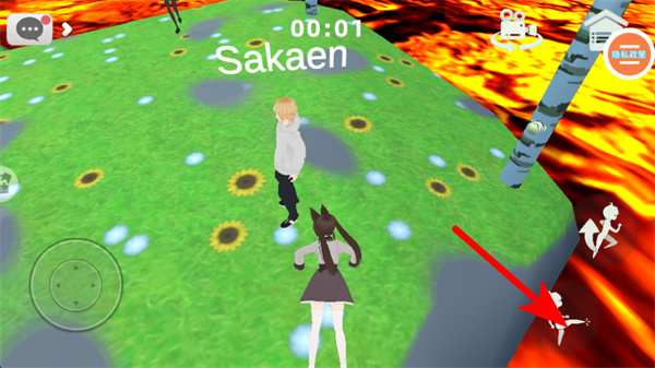 2、游戏中依照红色箭头指引,操作右侧的移动按钮控制角色移动,在场景内自由探索,靠近其他玩家或互动区域。