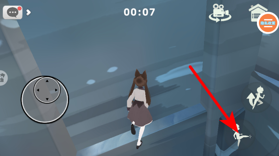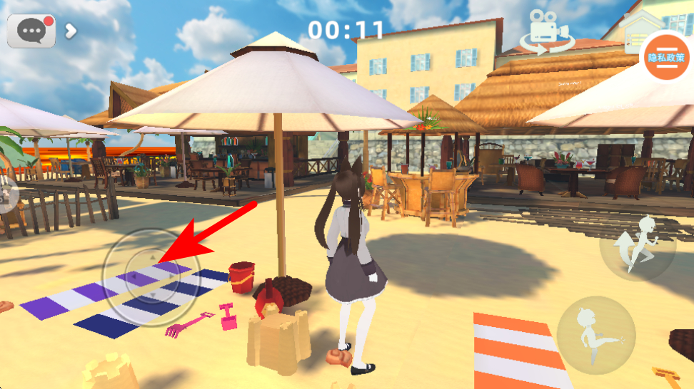 3、切换到沙滩场景时,依照红色箭头指引,通过摇杆调整角色位置,靠近场景内的道具如沙具,收集道具推进玩法。