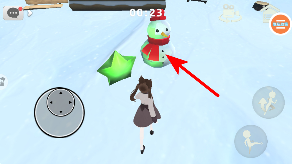 2、进入雪地场景后,紧跟红色箭头指引,操控角色靠近目标物品如雪人,完成场景内的互动任务,积累探索进度。